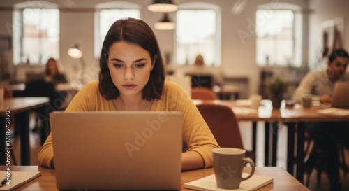 Woman focused on work in modern coworking office. Employee typing on laptop for business productivity and concentration.
