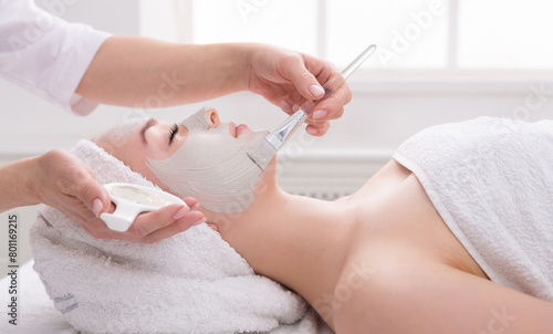 Woman gets face mask by beautician at spa