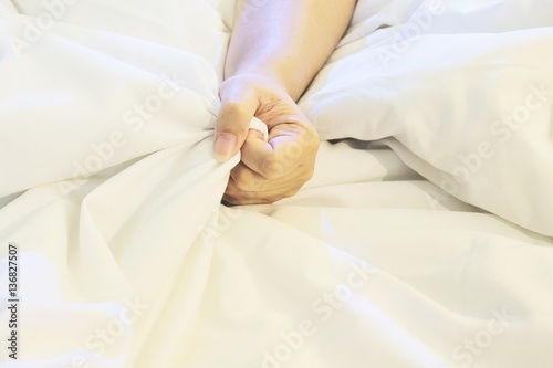 Woman hand holding bed sheet fabric tightly, sexual concept