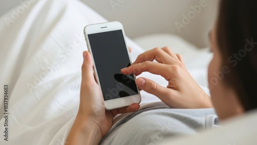 Woman Hand Using White Smartphone Touching Blank Black Screen While Lying in Bed, Relaxing