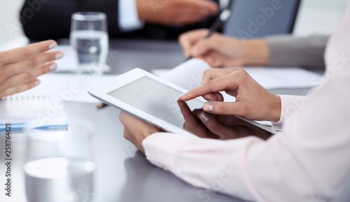 Woman hands using tablet at meeting. Business people group working together in office, close-up. Negotiation and communication concept