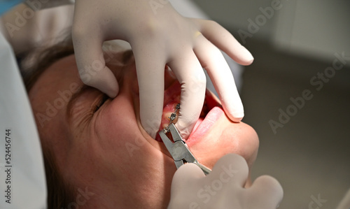 Woman having dental procedure in clinic. Concept of dentistry and orthodontic treatment.Close up of dentist hand using dental forceps while putting orthodontic braces on female patient teeth.