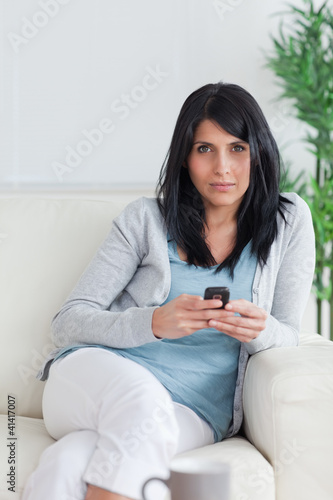 Woman holding a phone while relaxing on a couch