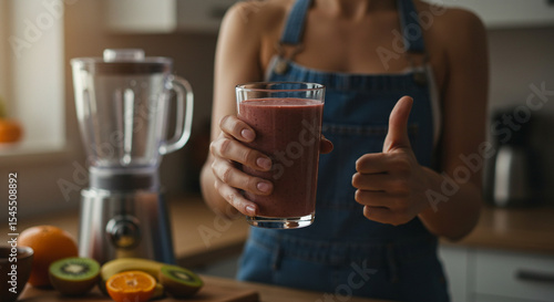 Woman holding a smoothie glass with one hand while showing a thumbs-up with the other