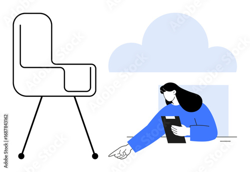 Woman holding a tablet points while seated near a chair, cloud icon in background signaling concepts thumbs up technology, remote work, and innovation. Ideal for digital workspace, creativity