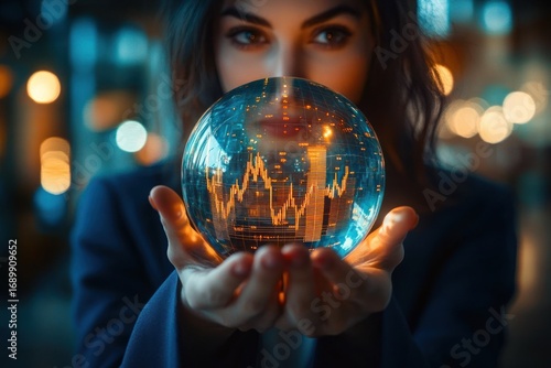 Woman holding a transparent sphere with glowing financial data and stock market charts inside, focused and contemplative expression in a dimly lit environment
