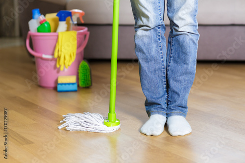 woman holding mop in the home.