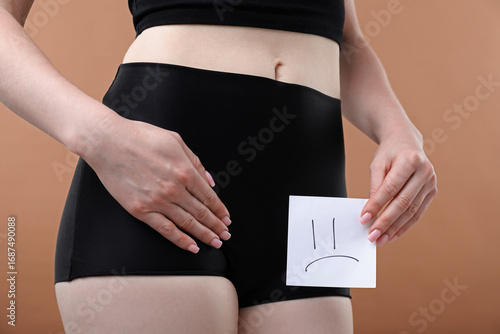 Woman holding sticky note with drawn sad face and suffering from cystitis symptoms on dark beige background, closeup