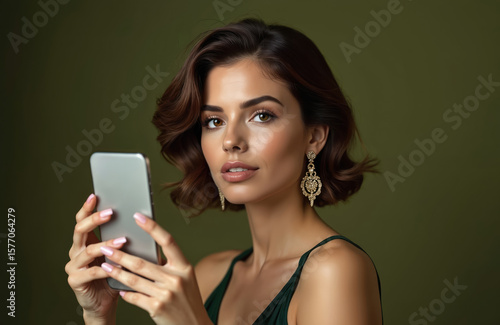 Woman holds smartphone on green background. She looks at screen with serious expression. Black dress, brown hair, silver phone. SAVE sign in foreground.