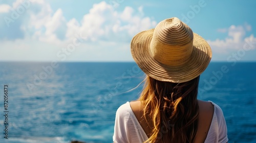 Woman in a Straw Hat Looking at Ocean rear view clouds in sky
