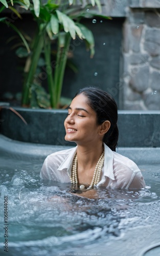 Woman in a white shirt, soaking in a hot tub, eyes closed and smiling, enjoying the relaxing warmth.
