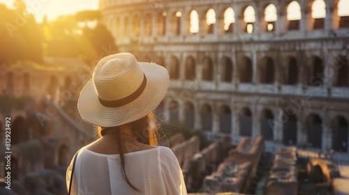 woman in hat stands and looking on Coliseum in Pula Croatia travel conceptYoung woman enjoy summer Italian vacation in Europe : Generative AI