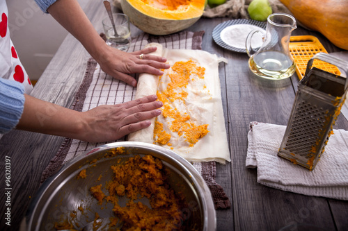 Woman in kitchen making prepares a pie with pumpkin, selective focus