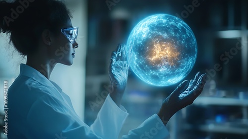 Woman in lab coat and glasses examining a glowing orb in a futuristic laboratory setting