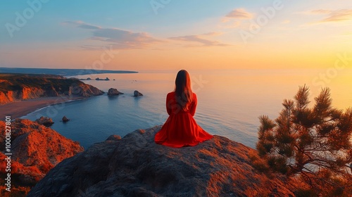 Woman in Red Dress on Cliff overlooking Ocean Sunset