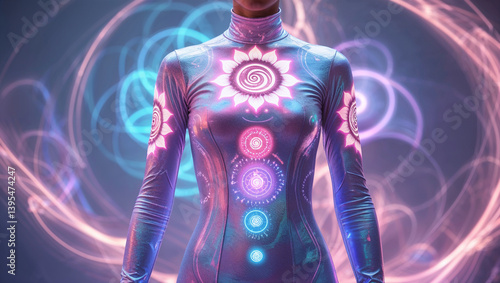 Woman In Spiritual Energy Suit Meditating With Colorful Chakras And Healing Light
