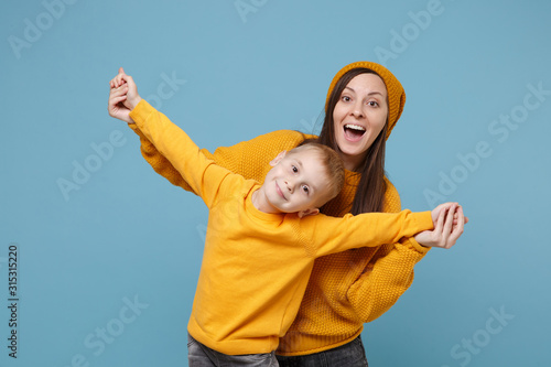 Woman in yellow clothes have fun posing with cute child baby boy 4-5 years old. Mommy little kid son isolated on blue background studio portrait. Mother's Day love family parenthood childhood concept.