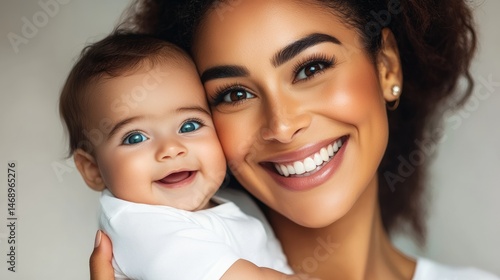Woman is holding a baby and smiling. The baby is smiling back at her. The image conveys a warm and loving moment between a mother and her child