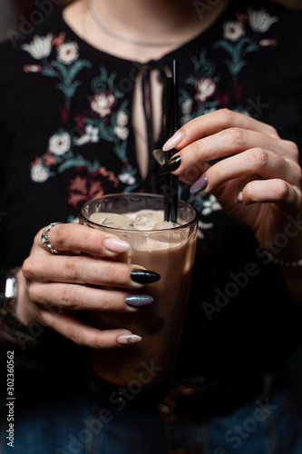 Woman is holding a glass of vanilla iced latte in hands with beautiful manicure