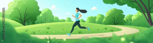 Woman jogging in a vibrant park surrounded by lush greenery and a curvy path under a bright blue sky