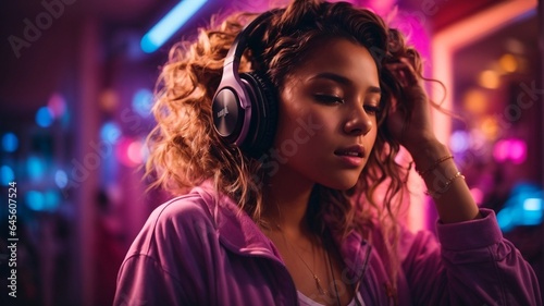 Woman listening to music, "International Music Day: A young woman with a pair of headphones, the walls illuminated by the vibrant, neon hues of the lights."