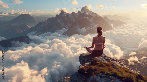 Woman meditating on mountain cliff above the clouds. alone travel healthy lifestyle. healthy life concept.