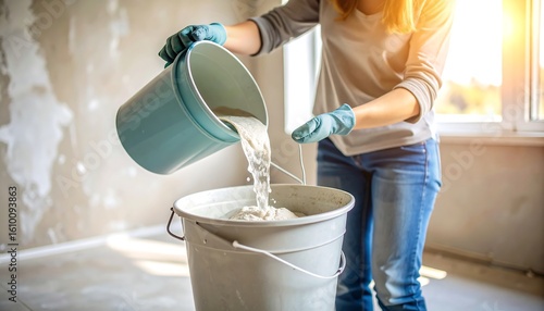 Woman mixing paint in buckets