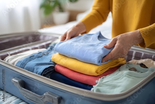 Woman packing suitcase on bed Hand, woman and suitcase for travel, adventure and holiday on a bed before leaving for vacation
