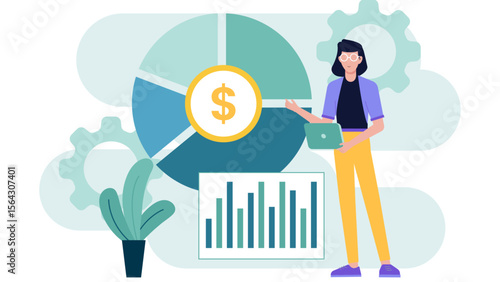 Woman presenting financial data charts and graphs. Suitable for business presentations, financial reports, marketing materials, websites, and educational materials on data analysis and statistics.