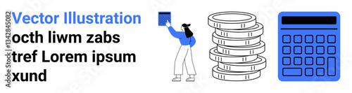 Woman reaching for a folder near stacked coins and a calculator. Ideal for finance, budgeting, accounting, bookkeeping, investment, business planning, simple landing page