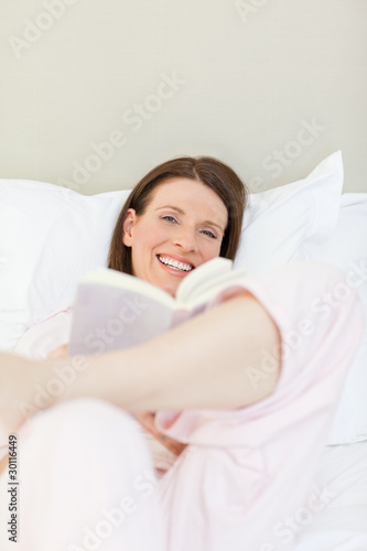 Woman reading a book on her bed