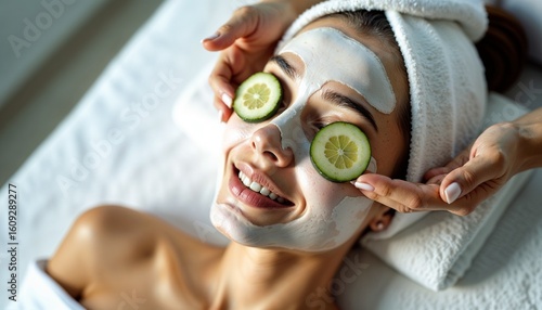 Woman receiving cucumber facial treatment with relaxed expression during spa session against white background