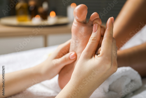 Woman receiving foot massage in spa salon, closeup. Bokeh effect