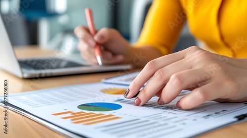 Woman Reviewing Financial Data and Charts at Desk