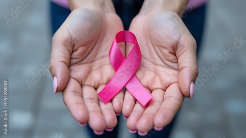 Woman s cupped hands holding a pink ribbon symbolizing breast cancer awareness
