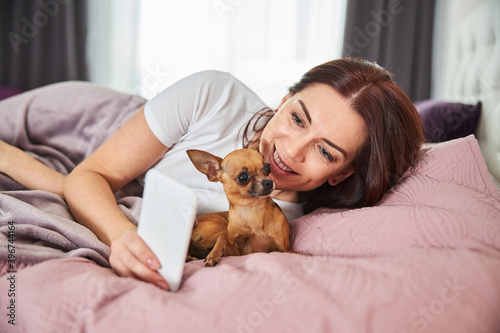 Woman showing a smartphone to a dog