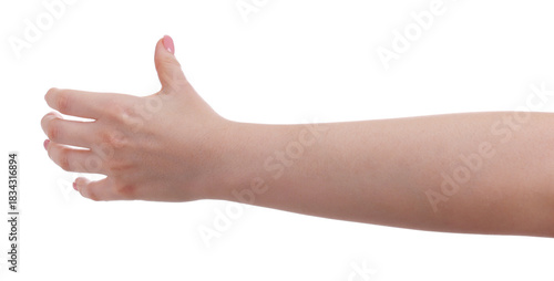 Woman showing gesture with hand on white background, closeup