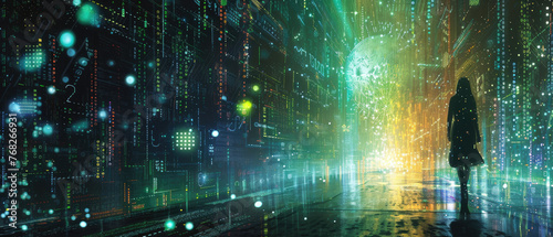 Woman silhouette on digital data background, banner with abstract network information. Theme of ai, cyber technology, code, future, hack, art.