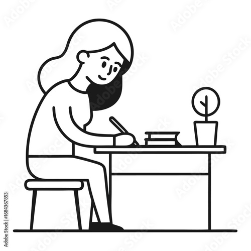 Woman Sitting At Desk Writing With Books And Plant On White Background girl person