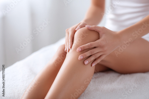 Woman sitting on a bed holding her knee in a bright room with natural light during daytime