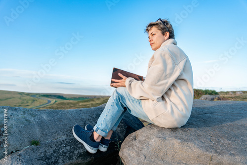 Woman Sitting on Rock With Book and Looking at View in English Countryside