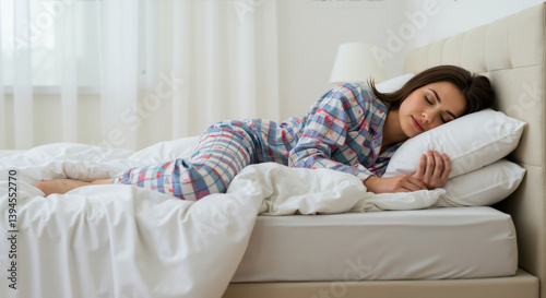 Woman sleeping in checkered pajamas on white bedding with pillows. Peaceful rest concept for sleep quality products and mattress advertisements