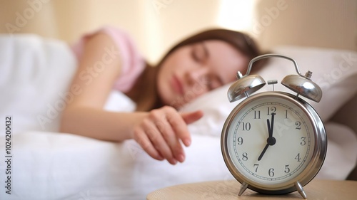 Woman sleeping peacefully beside alarm clock in cozy bedroom setting.