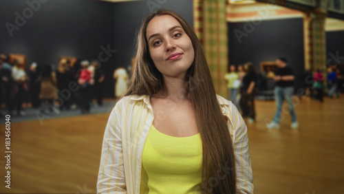 Woman smiling at camera in gallery building, close frontal pose with yellow tank top and long hair, visitors and paintings blurred behind her; quiet confidence.