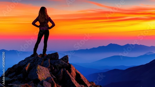 Woman Standing on Mountain Peak Against Vibrant Sunset Sky with Rolling Hills in Background