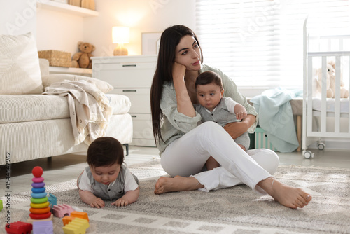 Woman suffering from postpartum depression with her little children at home