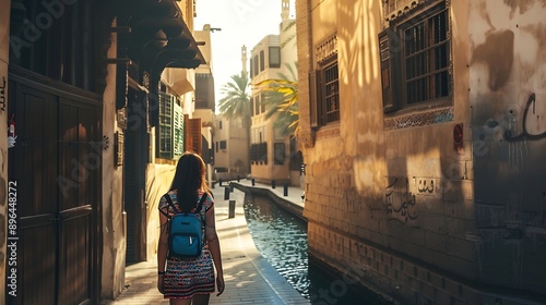 Woman tourist getting lost the old narrow streets of Bur Dubai and Creek Travel and sightseeing journey concept : Generative AI