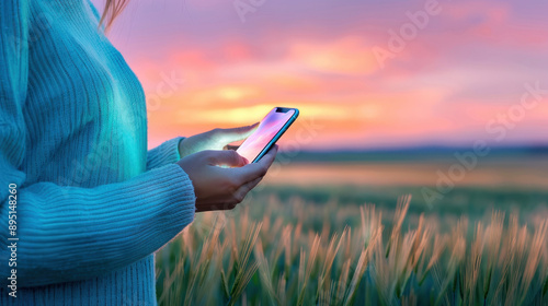 Woman using smartphone in field at sunset, wearing cozy sweater and standing in green grass with vibrant sky. Technology and nature fusion concept.
