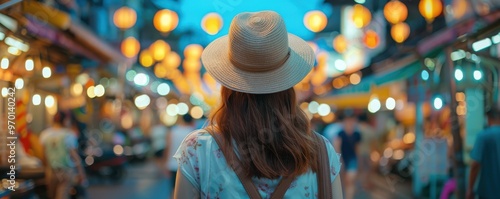 Woman wearing a straw hat exploring a lively, lantern-lit night market.