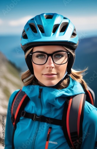 Woman wearing helmet and glasses stands confidently before towering mountain backdrop ready for adventure and exploration.She may be gearing up for bicycle ride or some other outdoor activity.